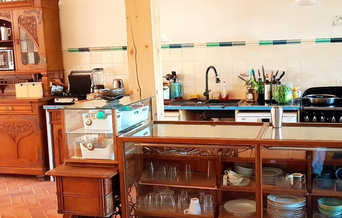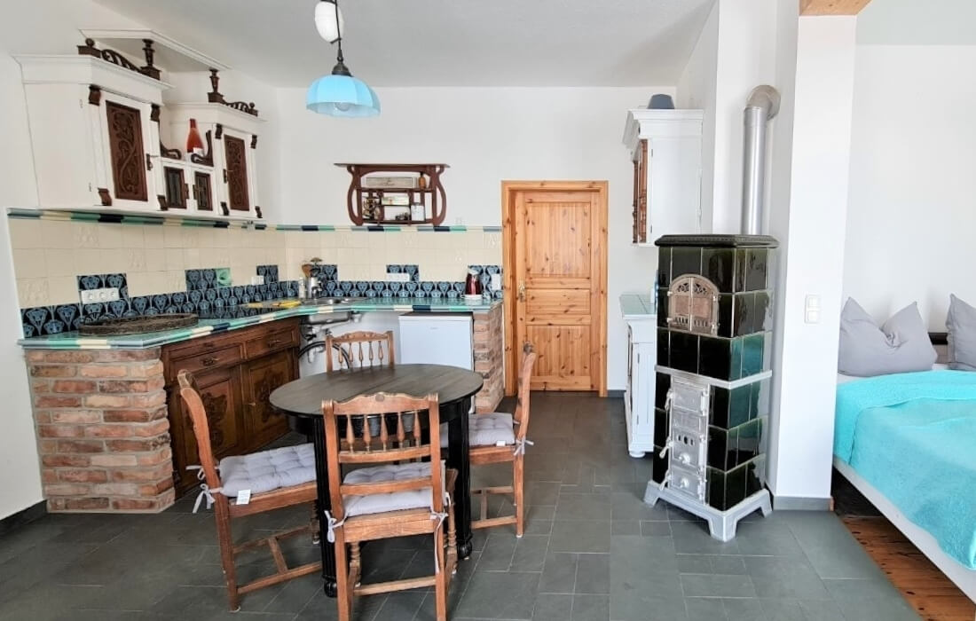 Kochen als Team: Die Küche ist für Gruppen gedacht – mit ausreichend Arbeitsfläche, großem Herd, ordentlicher Ausstattung und allem, was man für ein kulinarisches Miteinander braucht. An der langen Tafel hat jede*r Platz: Frühstück mit Blick in den Garten, gemeinsames Dinner oder das improvisierte Buffet, wenn alle von Strand, Schloss oder Radtour zurück sind.